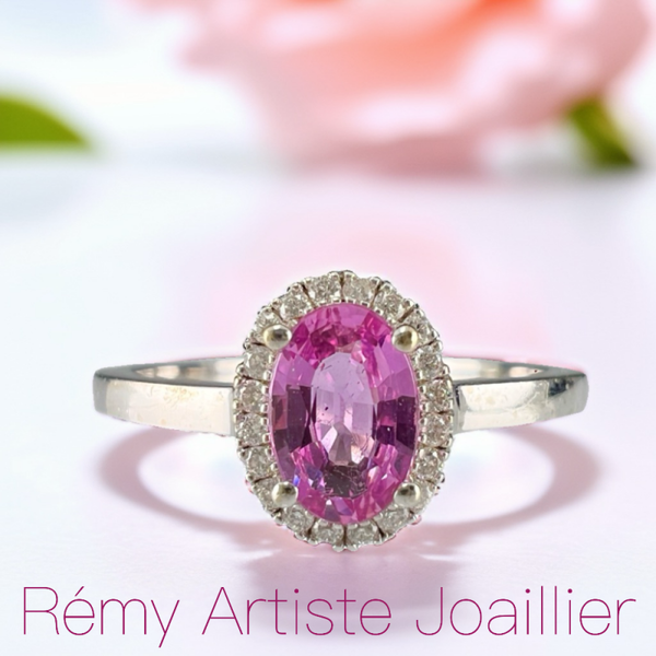 Le saphir rose ovale de 0,56 carat repose au centre, entouré d’un halo de 20 diamants minutieusement sertis (0,08 carat). L’ensemble est monté sur un anneau en or 750/1000, au poids structuré de 2,65 grammes.