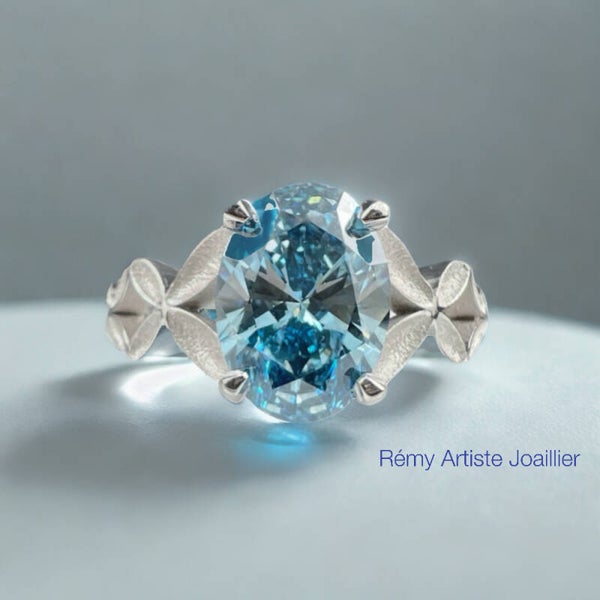 Ce diamant synthétique de 2,06 carats, couleur Fancy Vivid Blue, pureté VS1, semble concentrer un ciel entier dans son ovale profond. Il repose entre deux formes sculptées, tendues comme des ailes d’argent, sur un anneau en or 750/1000 de 4,68 grammes.