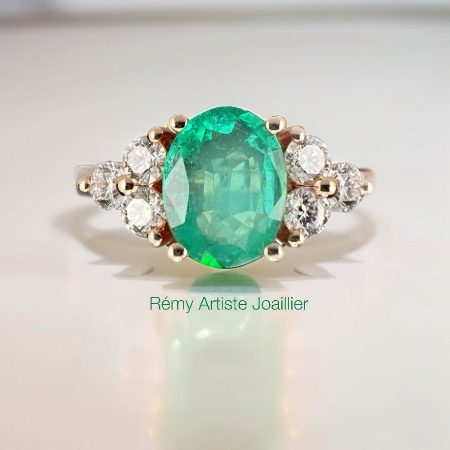 L’émeraude ovale de 1,03 carat, vive, lumineuse, respire entre deux bouquets de diamants (0,42 carat au total). La monture en or 750/1000, 3,80 grammes parfaitement répartis, ancre la pierre sans la contraindre.