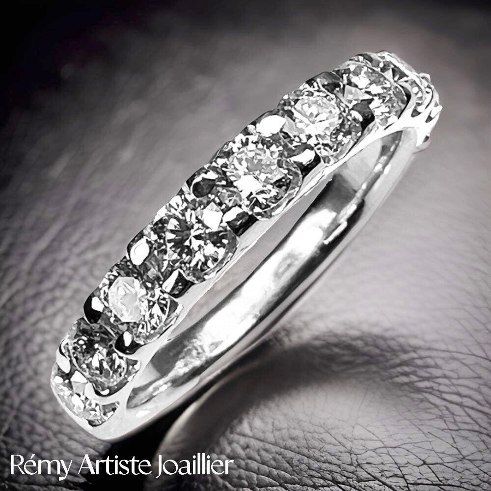 Sur un corps solide en or 750/1000 de 4,61 grammes, onze diamants synthétiques de très haute qualité (D/E – VS1), pour un total de 1,14 carat, sont sertis à fleur de peau. Le design est net, sans détour, sans artifice.