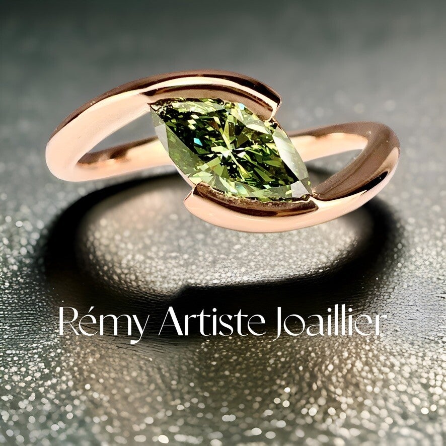 Elle ne tourne pas en rond. Elle avance.Un diamant synthétique vert, taillé en navette, certifié IGI, de 0,50 carat, vient fendre l’espace comme une promesse neuve. L’anneau en or blanc 750/1000, d’un poids de 3,25 grammes, s’élance autour de la pierre avec une tension douce, équilibrée.