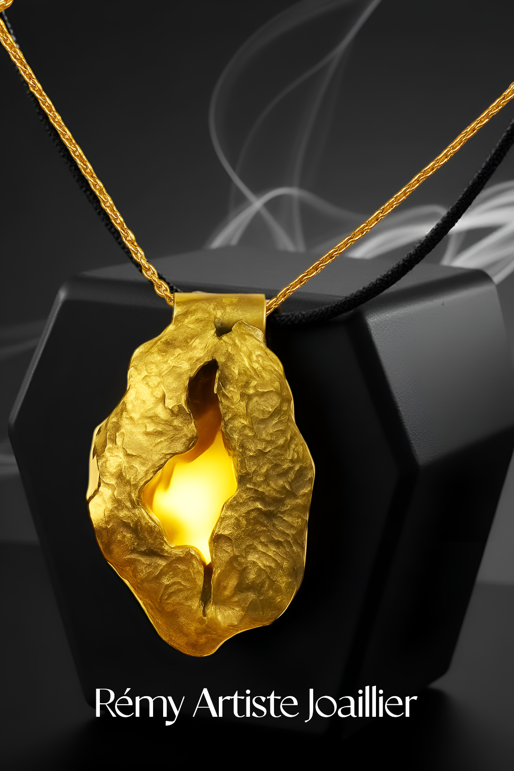 Sculpté dans 5,69 g d’or 750/1000, ce pendentif unique capte la lumière au cœur de la matière.
